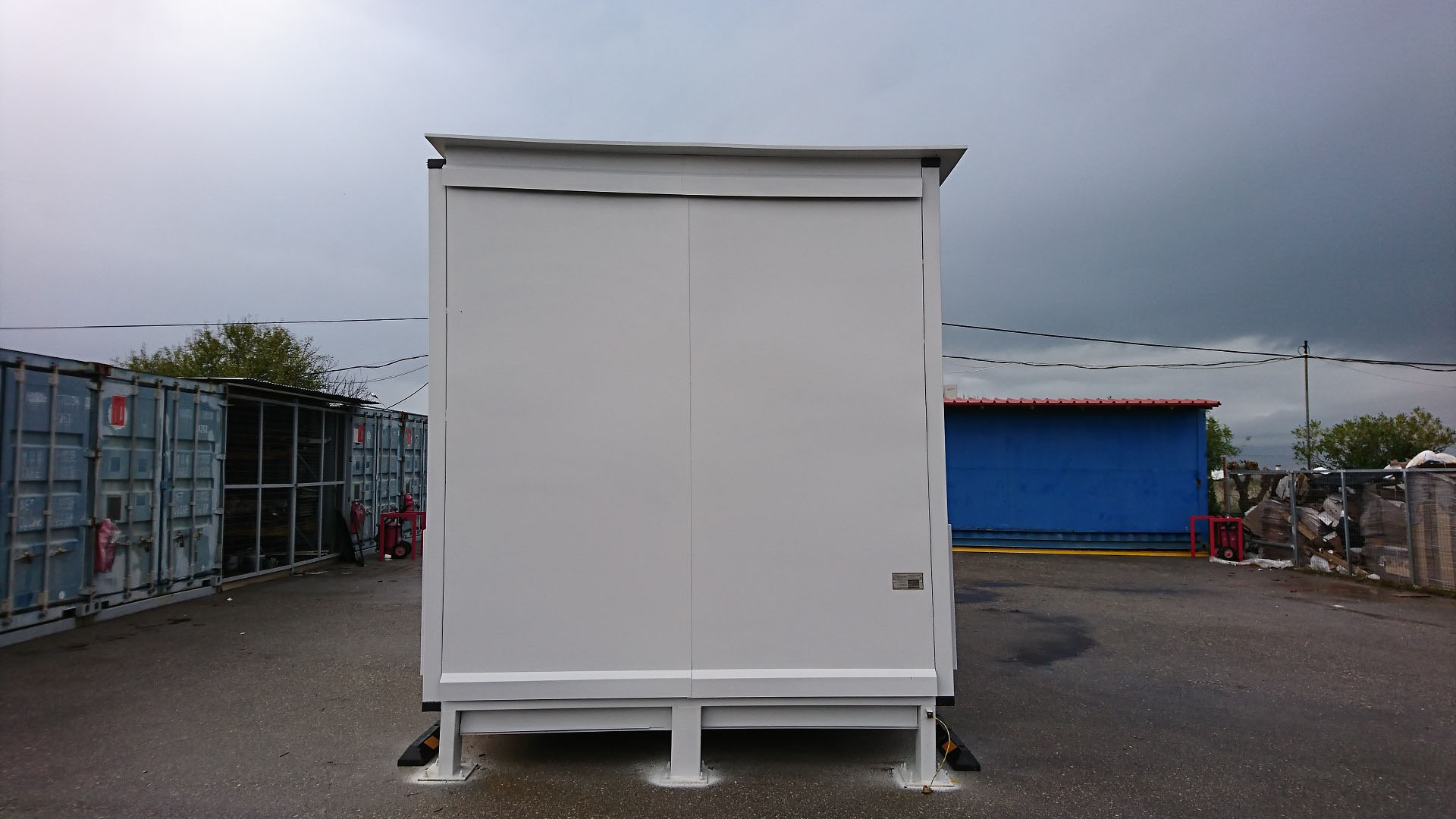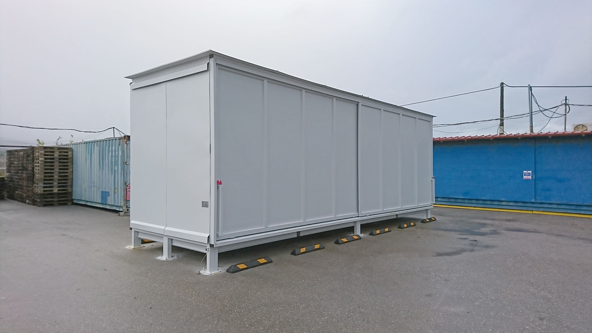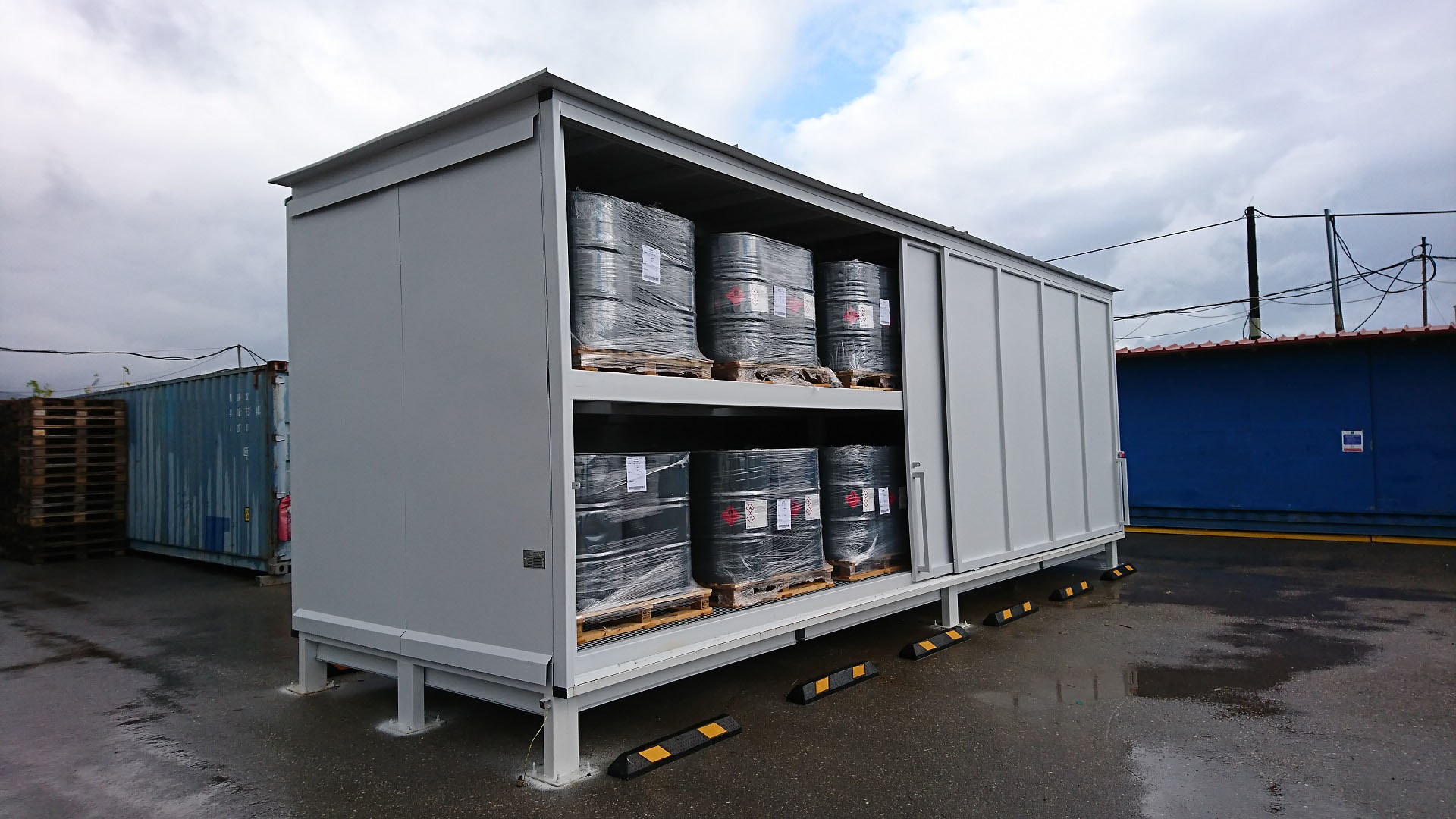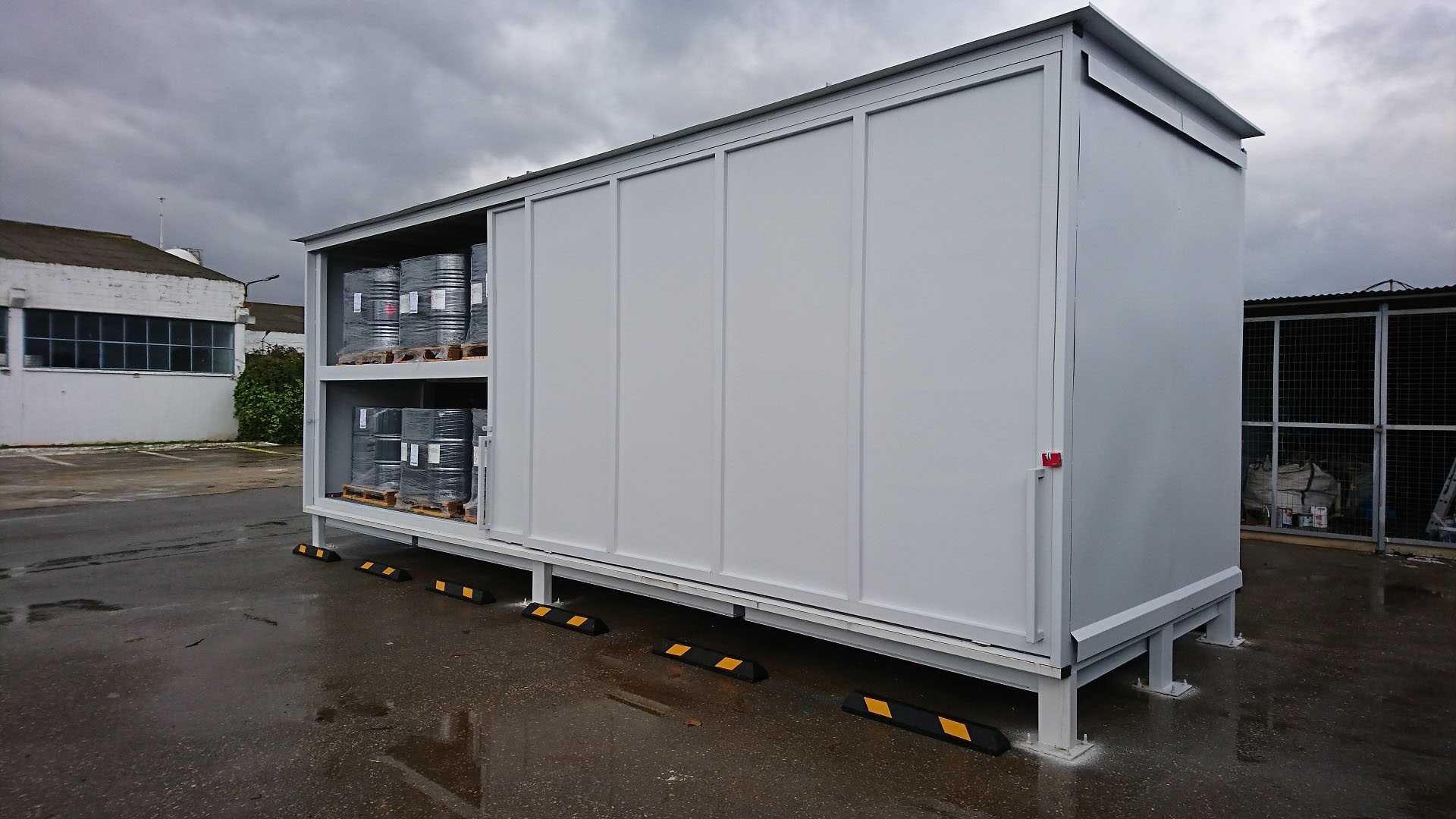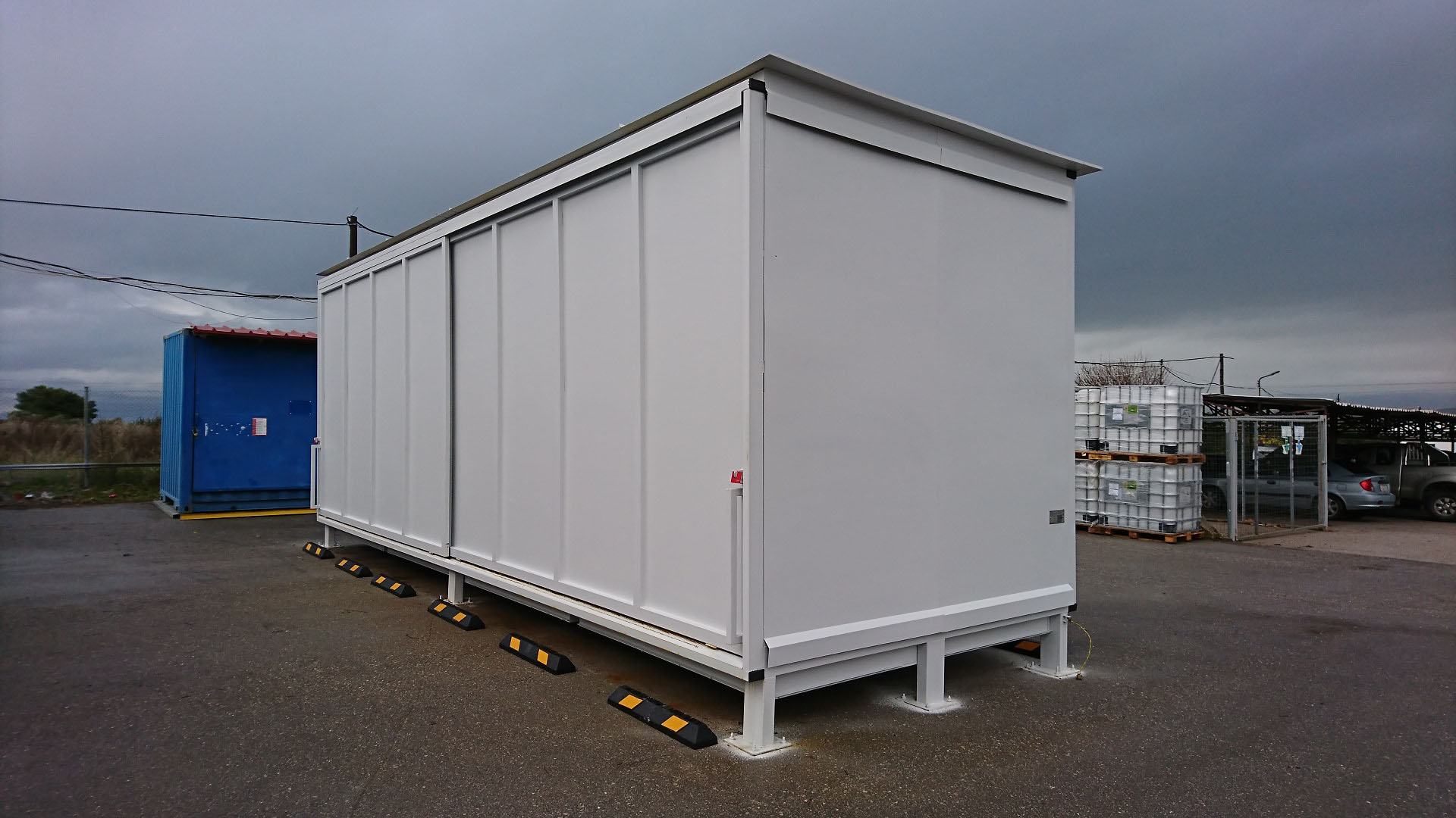 Οικίσκος κατασκευής ΒΙΟΜΑΝ για αποθήκευση 32 δεξαμενών IBC με σύστημα συγκράτησης και αποχέτευσης λυμάτων και 4 συρόμενες πόρτες. Η κατασκευή έγινε σε συμφωνία προς όλες τις σχετικές διεθνείς προδιαγραφές, αλλά και τις εξειδικευμένες απαιτήσεις του πελάτη (πολυεθνική
